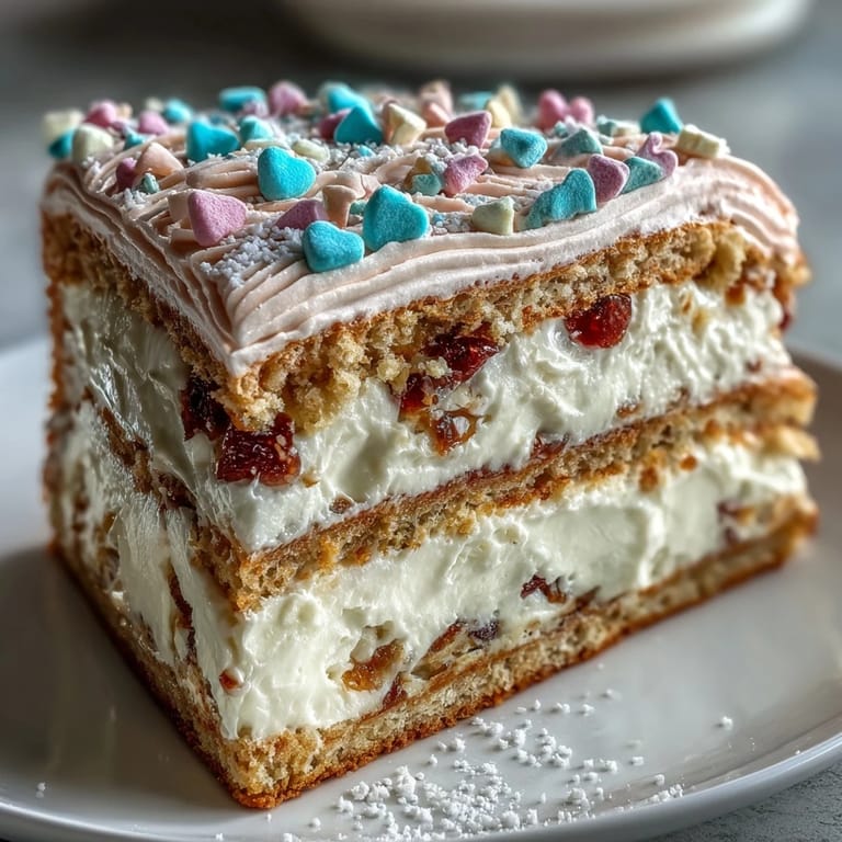 Save to Pinterest Every time I pull this out of the fridge, it feels like I'm serving a little piece of joy on a plate. The candy hearts make people smile before they even taste it, and that first bite, cool and creamy with a hint of crunch, is pure celebration.