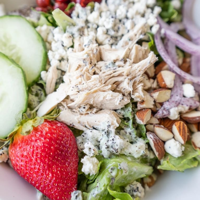 - In a large salad bowl, toss together the mixed greens, shredded chicken, sliced strawberries, cucumber, and red onion. The bowl should look absolutely bursting with color and life before you even add the dressing.